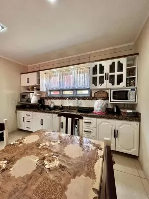 No térreo, a garagem foi transformada em um ambiente multifuncional com cozinha equipada, churrasqueira, fogão a lenha, sala de jantar e um banheiro adicional, ideal para reunir amigos e familiares em um espaço aconchegante.